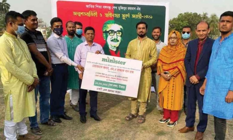 বঙ্গবন্ধুর জন্মশতবার্ষিকী ও স্বাধীনতার সুবর্ণজয়ন্তী উদযাপনে গৃহহীনদের পাকা ঘর নির্মাণের জন্য ১০ লাখ টাকার চেক হস্তান্তর করেছে মিনিস্টার গ্রুপ।